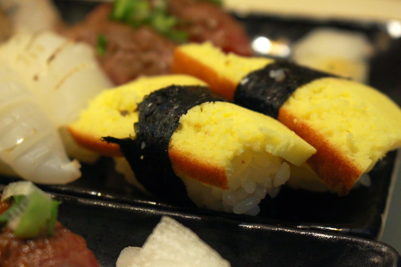 灑滿鮭魚卵的壽司晶瑩剔透在燈光的照耀下更顯透亮