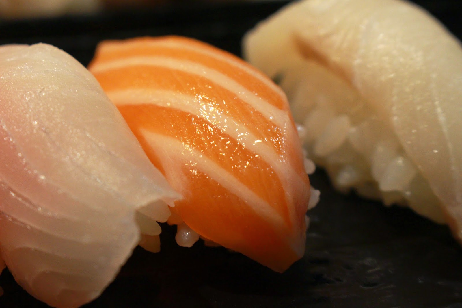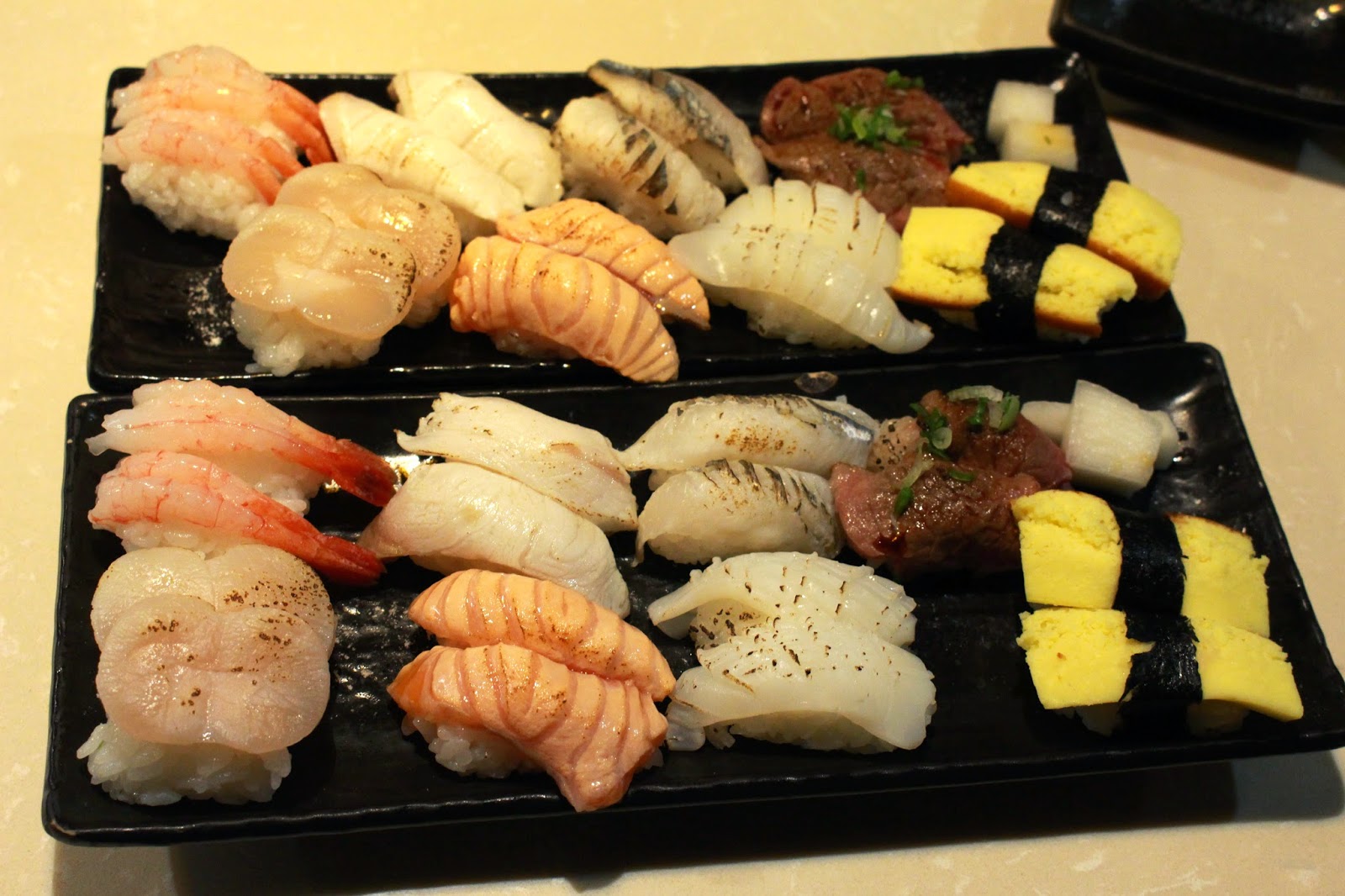 由右至左分別是綜合壽司.章魚.旗魚.鮭魚.海鱺魚.鮪魚.鯛魚