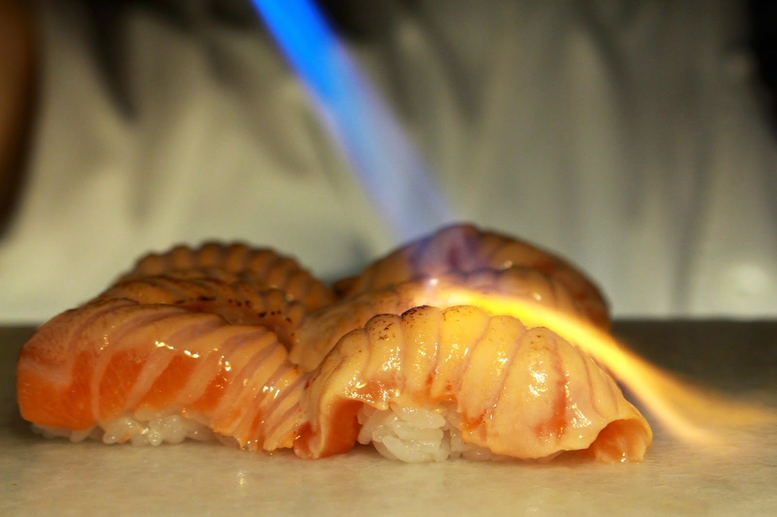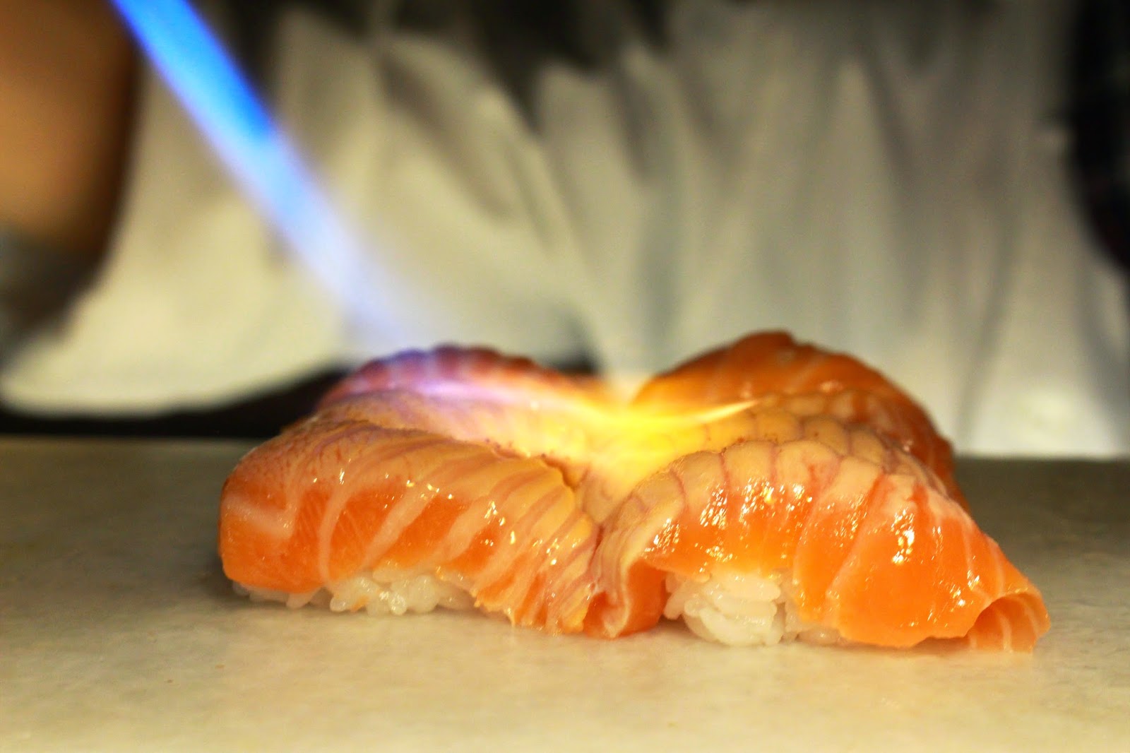 那噴槍輕輕掠過鮭魚的表面油脂在上頭不斷跳動沸騰